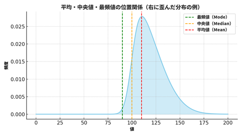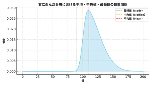 これらの位置関係を見ることで、分布が「右に傾いているのか」「左に傾いているのか」がわかります。