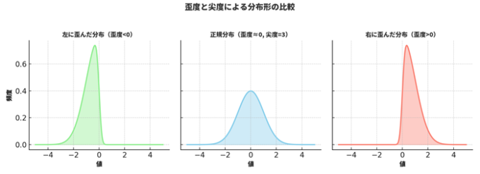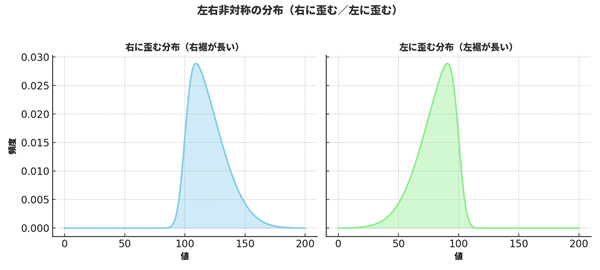 「右に歪んでいる」「左に歪んでいる」といった特徴を、数値で表す指標もあります。代表的なのが以下の2つです: