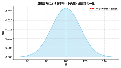 まず、もっともよく知られているのが正規分布(せいきぶんぷ)です。左右対称のきれいな山型で、平均=中央値=最頻値がほぼ同じ位置にあります。