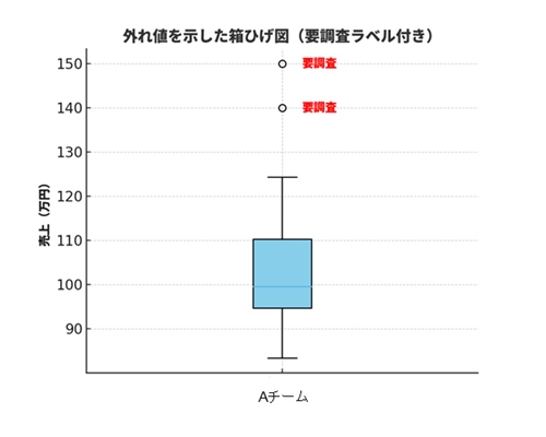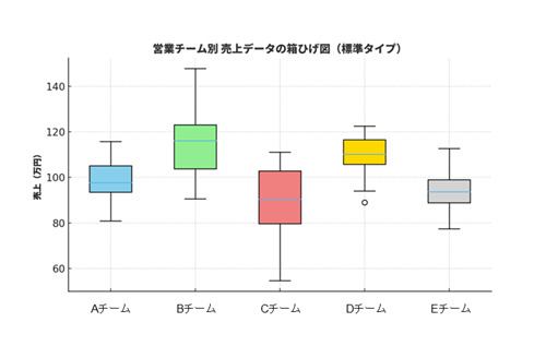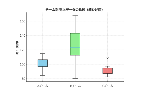 このように、箱ひげ図は「分布の形」を直感的に見せてくれるグラフです。たとえば、営業チームの売上データを比較すれば、「どのチームが安定しているか」「外れ値(突出した営業成績)があるか」も一目で判断できます。