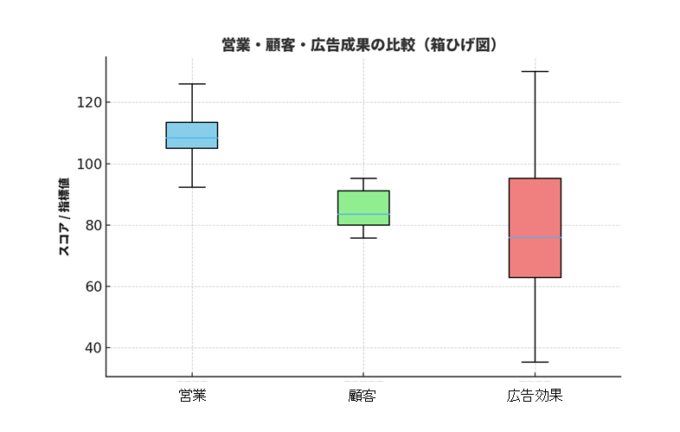 クリック率や獲得単価などのデータを箱ひげ図で比較し、成果が安定しているかを評価する。