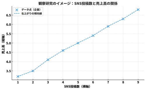 たとえば、SNS投稿数と売上の関係を調べたいとき、特に操作せずに「どのくらい投稿が多い会社ほど売上が高いか」を見るだけ──これが観察研究です。