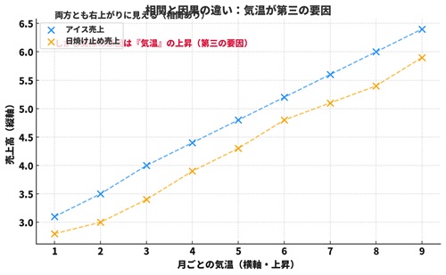 → 実際の原因は「気温が高い」ことで、2つの売上は直接の因果関係ではありません。