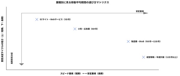 ・経営全体のモニタリング:長期(12か月以上)。季節性や一時的イベントを平滑化して把握。