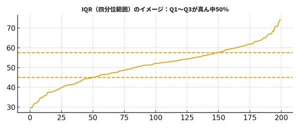 IQRは「データの真ん中50%がどれくらい広がっているか」を表しており、ばらつきの強さをつかむ指標です。IQRが大きいとデータの広がりが大きく、小さいとデータがまとまっています。
