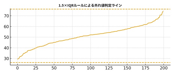 このような場合、1.5×IQRルールだけに頼ると、「仕様上当然の値」まで外れ値と判定してしまうことがあります。状況によっては、別の統計手法や業務知識と組み合わせて判断することが重要です。