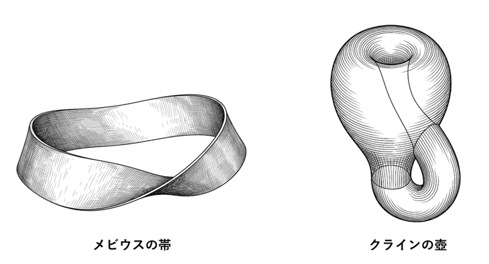 この世界では、裏表のない「メビウスの帯」や、壺の内部と外部がつながっている「クラインの壺」、さらに不思議な「射影空間」など、常識を覆すような図形がたくさん登場します。