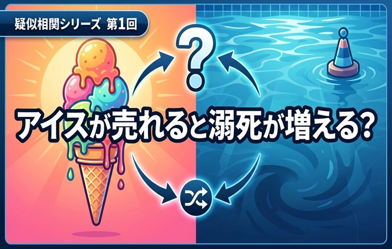 「アイスの売上が増えると溺死事故が増える」という相関が見えても、アイスが事故を増やしているわけではありません。