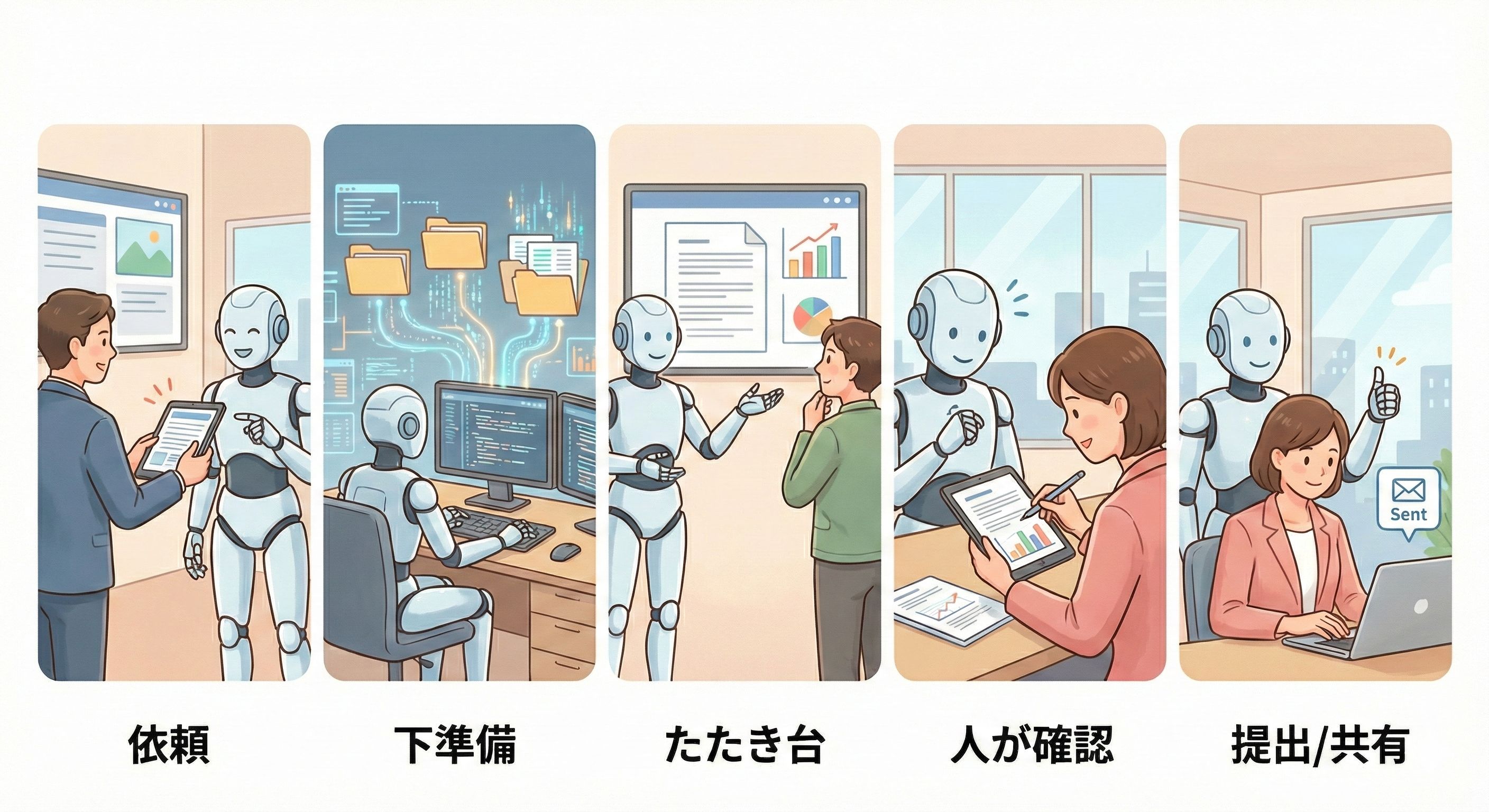 図1:AIの同僚が働く流れ(依頼→下準備→たたき台→人が確認→提出/共有)