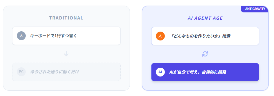 一方でantigravityのようなツールでは、AIが開発の中心になります。