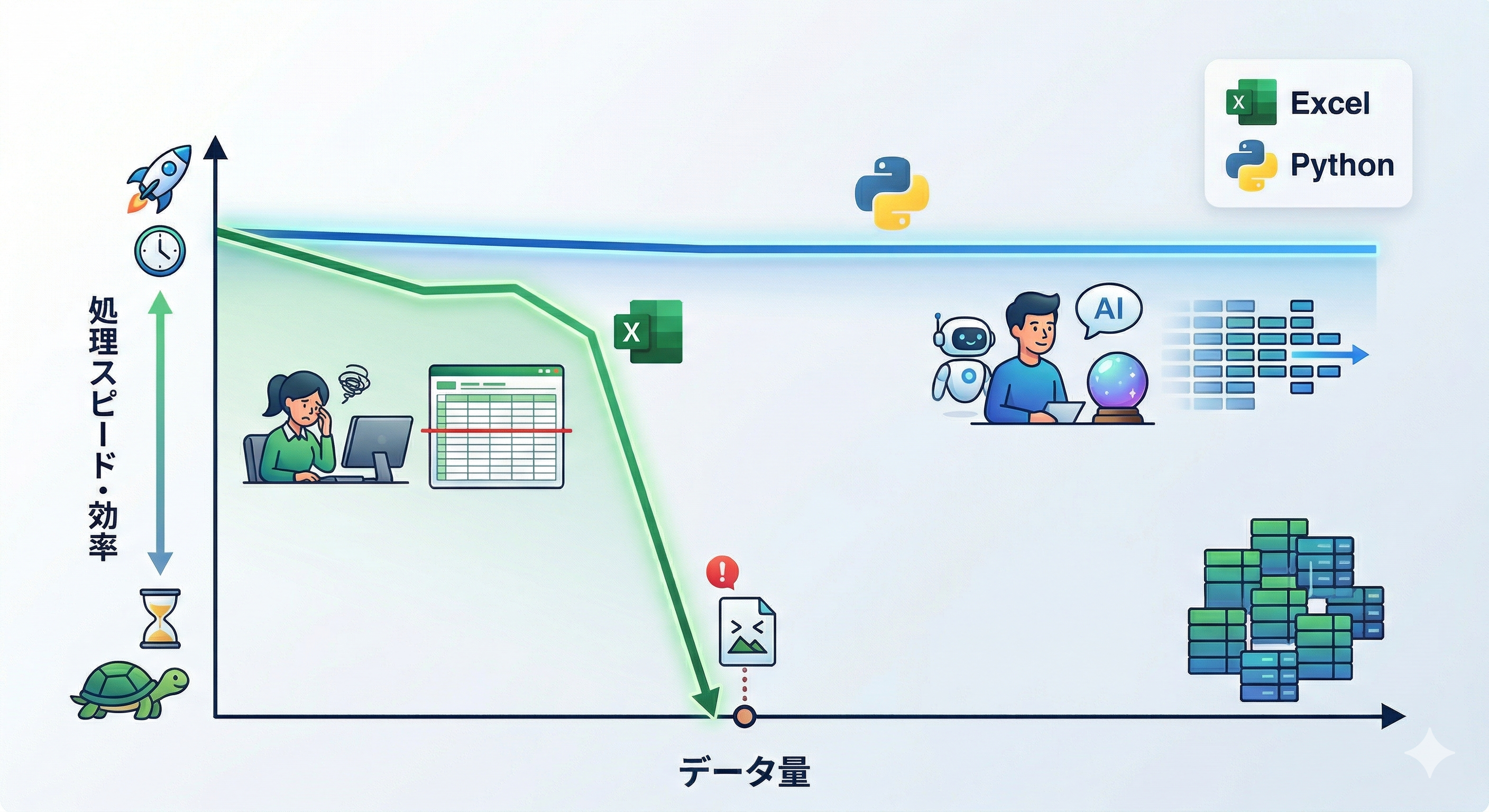 Excelは非常に優れたツールですが、明確な限界があります。一つは、1シートに「1,048,576行」までしかデータが入らないという物理的な制約。もう一つは、大量の数式を含むと動作が極端に重くなるというパフォーマンスの問題です。