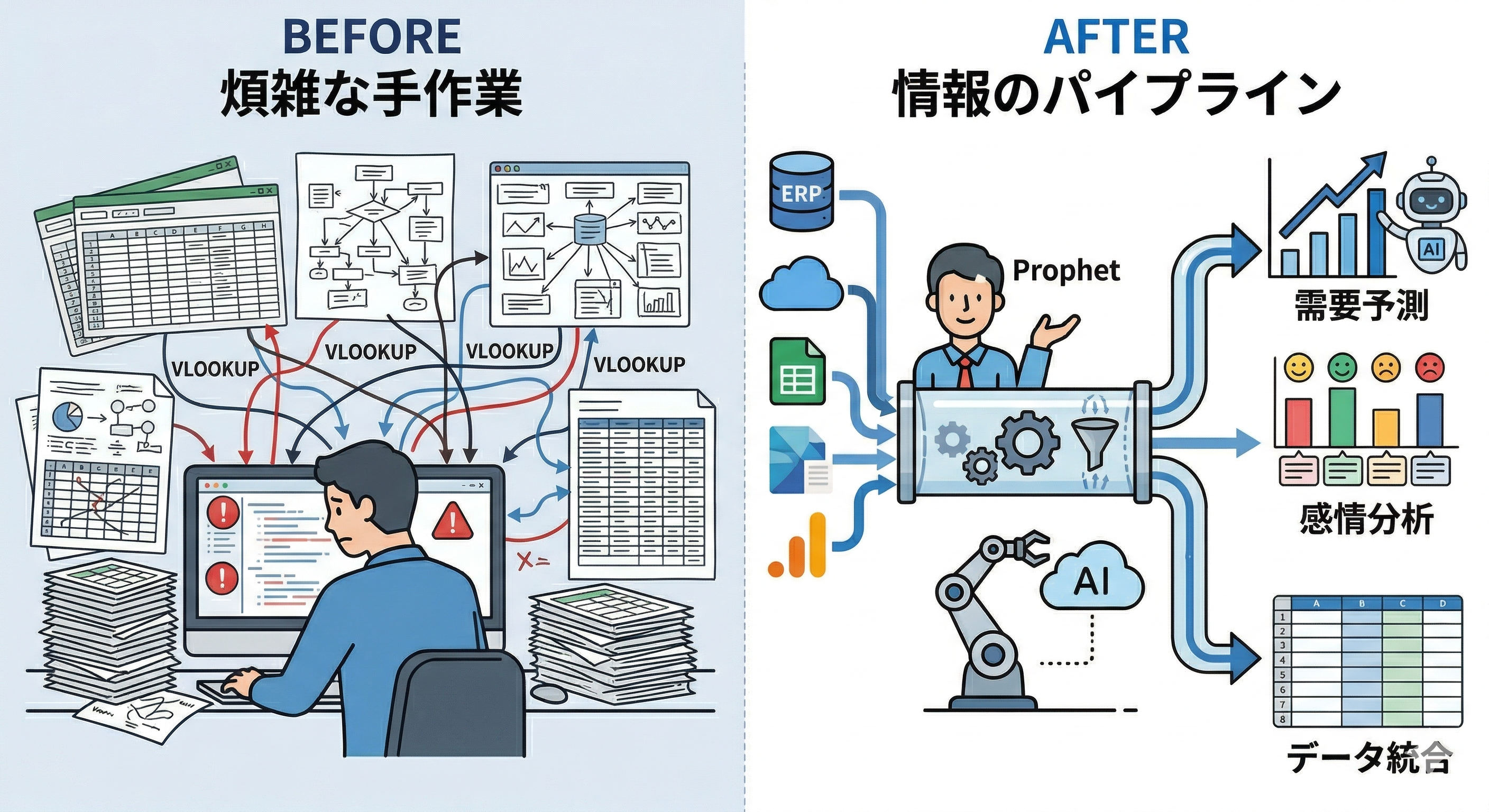 「基幹システムの売上データ」「Googleアナリティクスのアクセスログ」「広告の成果データ」——これらを一つの表にまとめる作業は、VLOOKUP関数を駆使しても一苦労です。プログラミングなら、形式の異なるデータを一括で連結し、矛盾がないかチェックする処理まで自動化できます。
