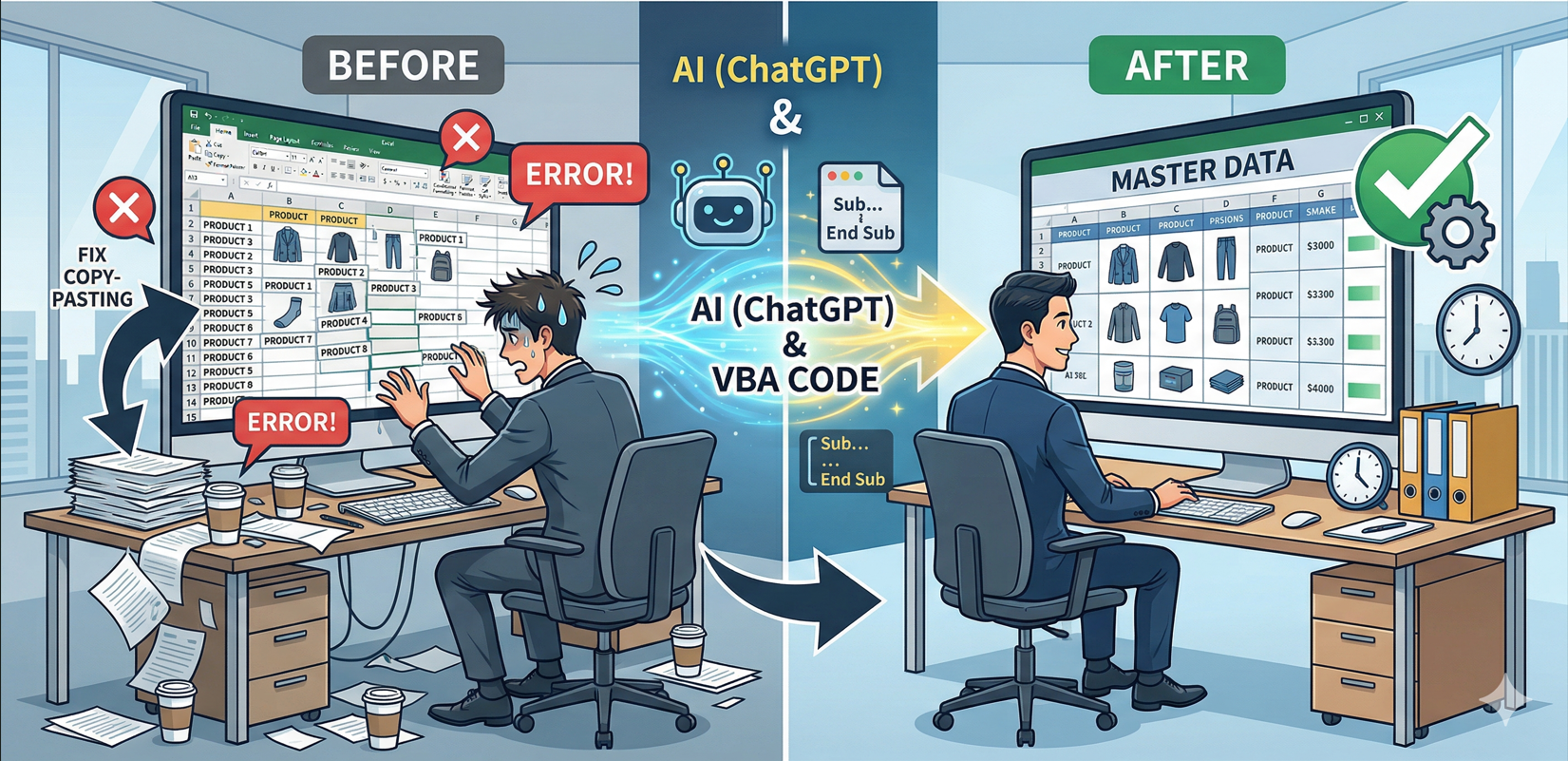 新商品が追加されるたび、あるいは仕様が変わるたびに、Excelの表は少しずつ崩れていきます。行数がズレ、項目の順序がばらけ、過去データとの比較どころか、単純なコピー&ペーストすら思うようにいきません。その結果、毎日数時間を「表の形を整えるだけ」という作業に費やさざるを得ませんでした。