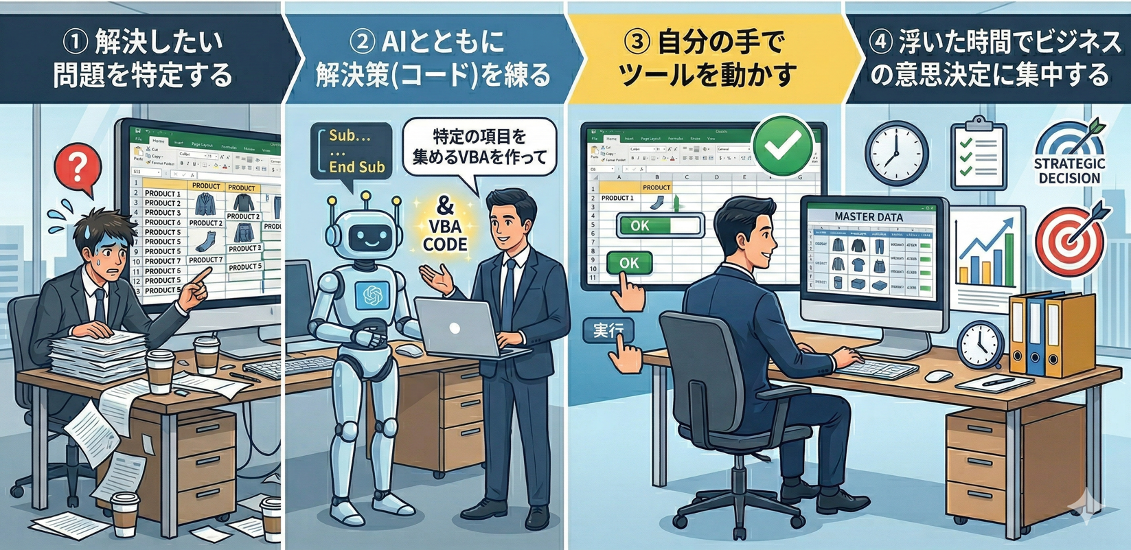 そこで方針を切り替え、使い慣れたExcel上で動くVBA(マクロ)を採用することにしました。彼一人では手が届かないコードも、隣に生成AIツールという心強い相棒がいます。