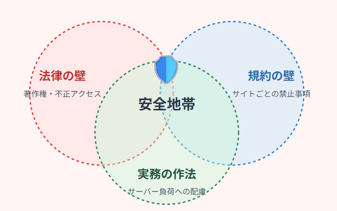 法律が「一般的、包括的なルール」であるのに対し、規約は「そのサービスを利用する上での個別の約束事」です。規約を無視して強引に収集を続けると、そのサイトの利用を永久に禁止されたり、契約違反として法的措置をとられるリスクもあります。