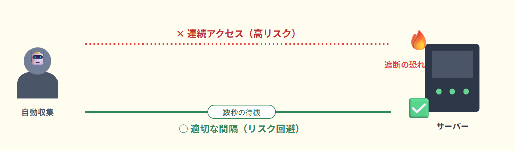 ◆ 「1秒以上」の空きを作る: 1回情報を取得したら、次のリクエストまで最低でも1秒(できれば数秒)の休みを入れるのが標準的です。