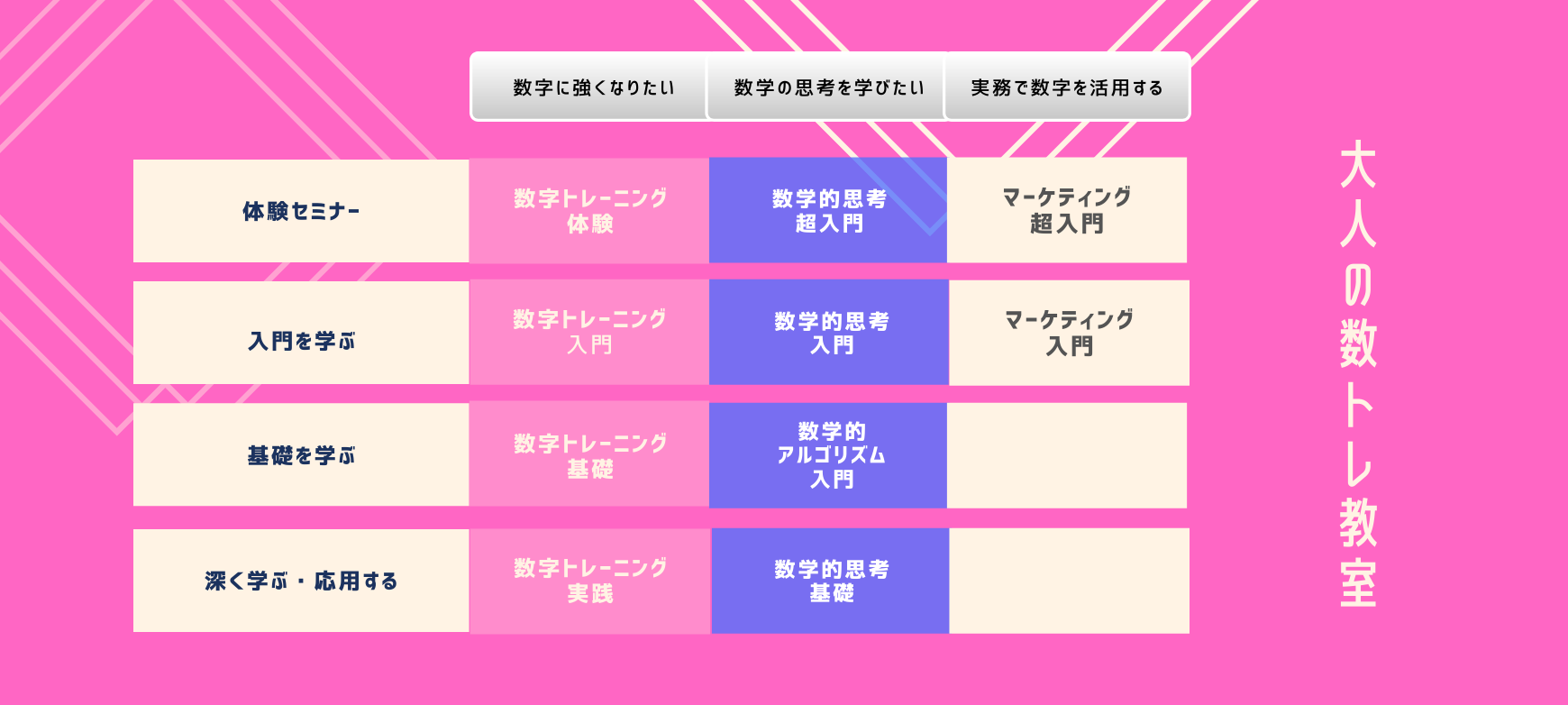 大人の数トレ教室のカリキュラムは、これまで2000名以上の方に受講いただいており、多くの”数字は苦手”という方が得意になったり数字に強くなったりしてきました。少なくとも苦手意識は薄れると思います。もちろん、人によって程度は異なりますので、まずは数字トレーニング体験セミナーをご受講下さい。どんな風に学べるのか体験頂けると実感がわくはずです。